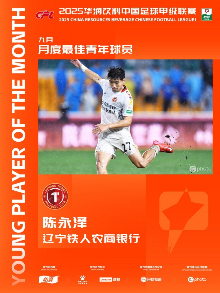 2025-11-01 00:18:27中甲官方:辽宁铁人球员陈永泽获9月最佳青年球员,斩1球1助攻