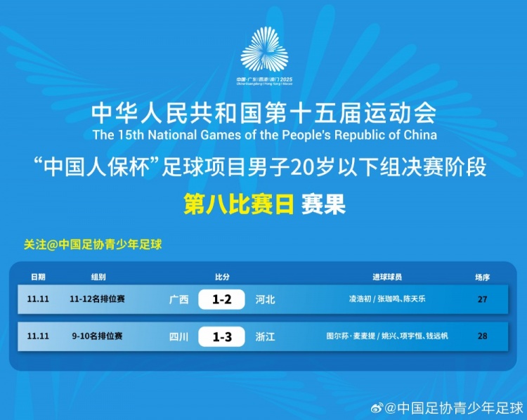 中华人民共和国第十五届运动会“中国人保杯”足球项目男子20岁以下组决赛阶段第八比赛日赛果???????? ​​​